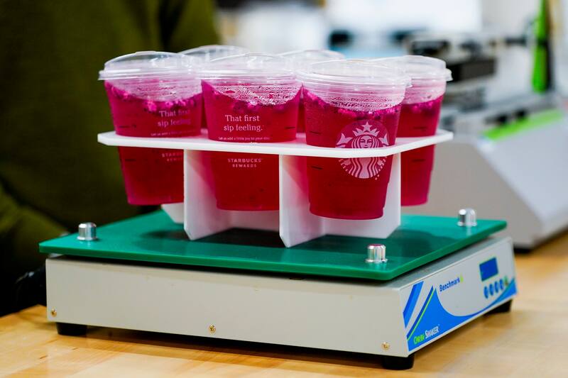 Se está produciendo un proceso de prueba y refinamiento similar con los vasos desechables para bebidas frías. En el laboratorio de innovación del Tryer Center en la sede de Starbucks en Seattle, las bebidas con hielo en vasos de plástico se colocan en soportes sujetos a una plataforma. Luego se agita mientras los técnicos buscan fugas y defectos.