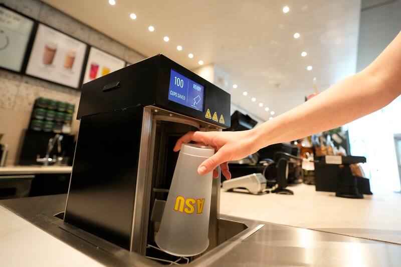 En la tienda del estado de Arizona, si los clientes no traen su propio vaso, se les entrega uno de plástico reutilizable con el logotipo de Starbucks. Si lo devuelven, obtienen US$ 1 de descuento, al igual que los clientes que traen el suyo. ¿Y si no quieren conservarlo? Hay contenedores alrededor del campus, y la universidad lava los vasos -parte de una asociación con Starbucks- y los devuelve a la tienda.