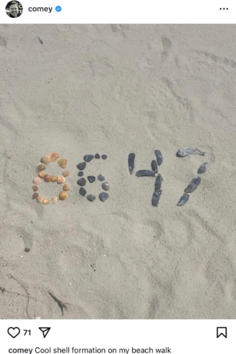 El anuncio de Noem se da por una publicación de Comey en Instagram. “Formación de conchas genial en mi paseo por la playa”, sostiene el posteo, acompañada por una fotografía que mostraba el número “86 47” formado por las corazas.