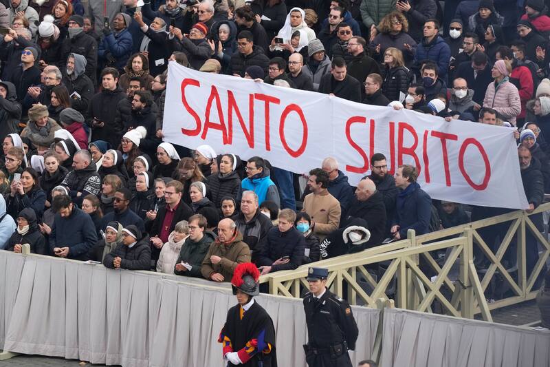 Al final de la ceremonia en la Plaza de San Pedro, algunas personas gritaron en italiano “santo súbito!” (“¡Santo ya!”), pidiendo así la canonización de quien dirigió la Iglesia Católica entre 2005 y 2013. La misma frase se había usado en 2005 para el funeral de Juan Pablo II, y nueve años después fue el Papa Francisco quien proclamó santo a Karol Wojtyła.