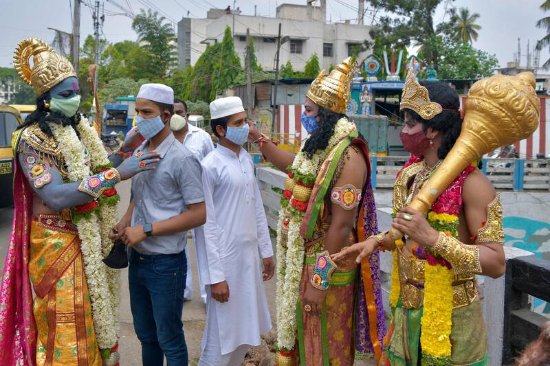 Hombres vestidos como deidades hindúes distribuyen mascarillas durante una campaña de sensibilización contra la propagación del Covid-19 en Bangalore, en abril de 2021. Foto: AFP MANJUNATH KIRAN