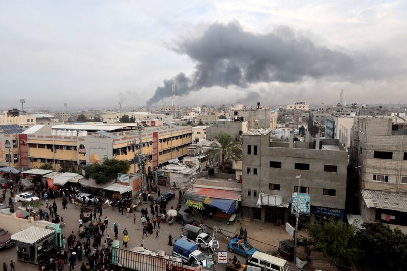 El aire retumbaba con el constante ruido sordo de las explosiones y espesas columnas de humo blanco se elevaban sobre la densamente poblada ciudad, repleta de personas desplazadas de otras partes del enclave.