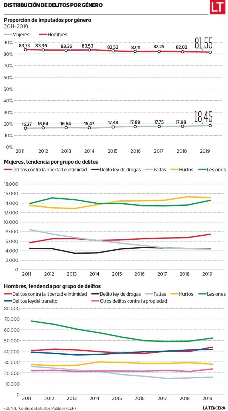 Los datos recogidos por el CEP de la Defensoría Penal Pública (DPP) evidencian que la proporción de mujeres imputadas es menor que la de los hombres. Los resultados, cuyo análisis abarca el periodo de 2011 a 2019, muestran que la proporción de mujeres imputadas en 2011 fue de un 16%, ascendiendo a un 18% en 2019. Mientras que en el caso de los hombres, la proporción es mucho mayor: en 2011 fue de 83%, teniendo una pequeña disminución hacia el final del periodo, con un 81% en 2019.