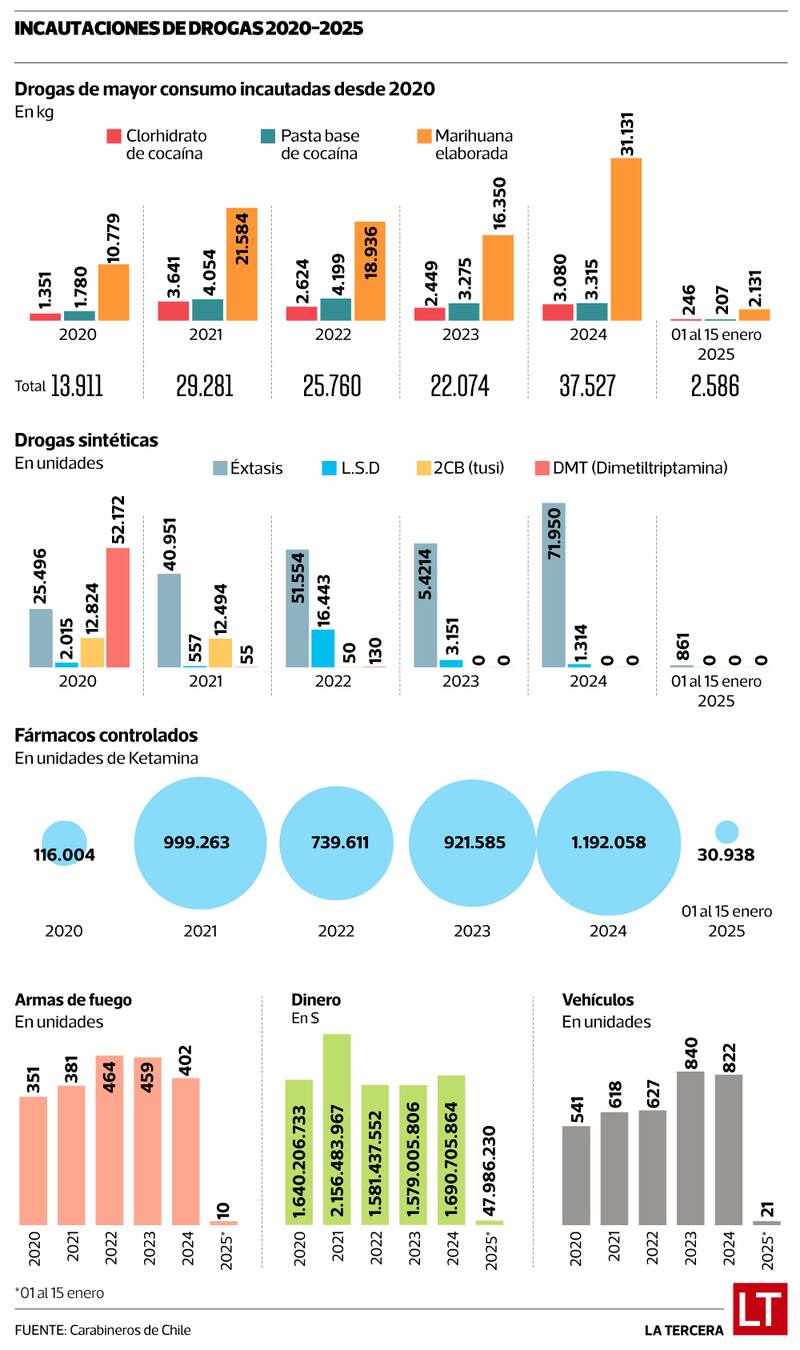 Además de esa abultada cifra, la policía también ha incautado otros tipos de estupefacientes. A la marihuana ya procesada el OS-7 también ha decomisado 28.279 plantas de marihuana, aunque existe especial alerta en las drogas sintéticas. Lo anterior, se explica porque si en 2021 se detectaron 40 mil unidades de éxtasis, el año pasado esa cifra ascendió a 71 mil y las dos primeras semanas del 2025 ya van 861 dosis. Si bien esa es la droga que presenta el mayor aumento, también los últimos años hay otros elementos detectados como el LSD, el DMT o más conocido como “la molécula de dios”, por su fuerte poder alucinógeno.