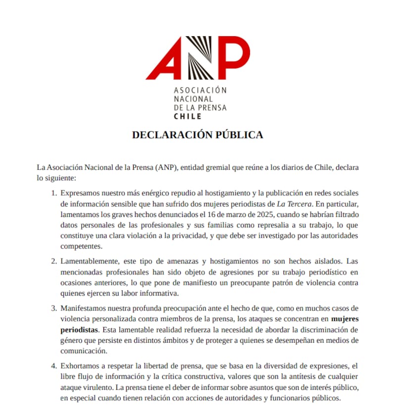 Mediante una declaración pública la ANP señaló: “Expresamos nuestro más enérgico repudio al hostigamiento y la publicación en redes sociales de información sensible que han sufrido dos mujeres periodistas de La Tercera. En particular, lamentamos los graves hechos denunciados el 16 de marzo de 2025, cuando se habrían filtrado datos personales de las profesionales y sus familias como represalia a su trabajo, lo que constituye una clara violación a la privacidad, y que debe ser investigado por las autoridades competentes”.