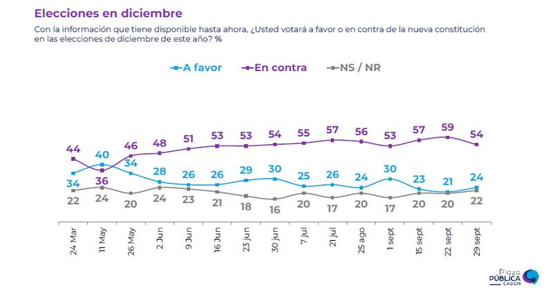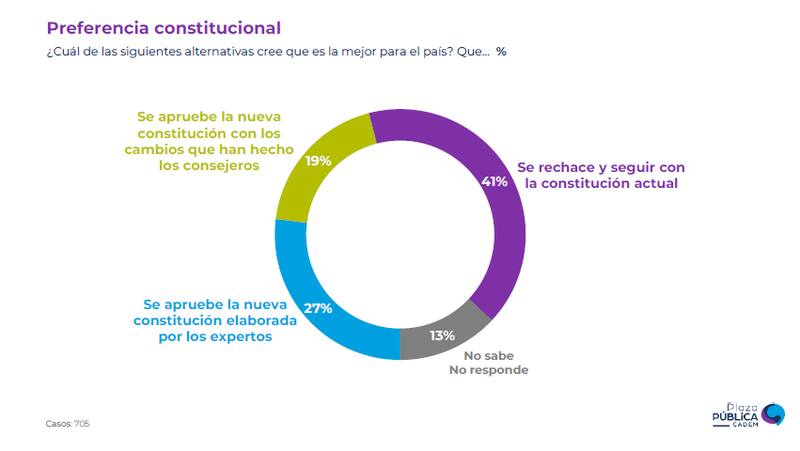 El sondeo de opinión que se realizó durante la última semana de septiembre se reflejó en la encuesta 507, donde la muestra de 705 casos respondió a la pregunta “¿Cuál de las siguientes alternativas cree que es la mejor para el país?”, donde un gran porcentaje se inclina por continuar con Constitución vigente y solo un 19% respaldaría el texto que se redacta y que incluye los cambios que han realizado los consejeros constituyentes.