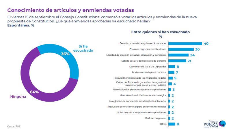 En tanto, solo un 19% estaría por aprobar el texto que incluye las modificaciones que han realizado los miembros del Consejo Constitucional. Un 64% aseguró no haber escuchado de las enmiendas que se discuten en el consejo.