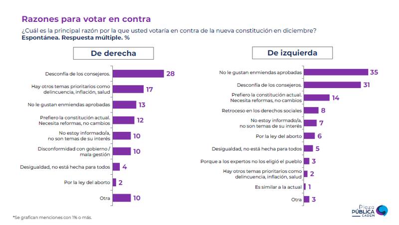 Desde la “izquierda”, un 35% rechazaría porque “no le gustan las enmiendas aprobadas” y un 31% lo haría porque “desconfía de los consejeros”. Otro 14% dice que no aprobaría porque “prefiero la Constitución actual. Necesita reformas. No cambios”.