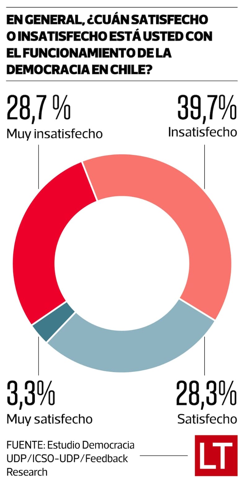 Sin embargo, un porcentaje mucho mayor de chilenos (68,4%) se declara insatisfecho o muy insatisfecho con el funcionamiento de la democracia en Chile, lo que se suma a la alta desconfianza que existe en las instituciones y en su capacidad de abordar las demandas más acuciantes de las personas.