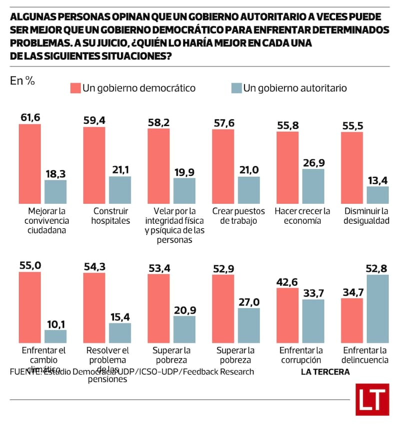 Un estudio de la Universidad Diego Portales y Feedback Research investigó la percepción de los chilenos entre democracia y autoritarismo, y la eficacia de estos sistemas de gobierno para responder a las demandas de la población. Y aunque la democracia mantiene una alta valoración, frente a la crisis de seguridad un 52,8% cree que un gobierno autoritario lo haría mejor que uno democrático a la hora de combatir la delincuencia en Chile.