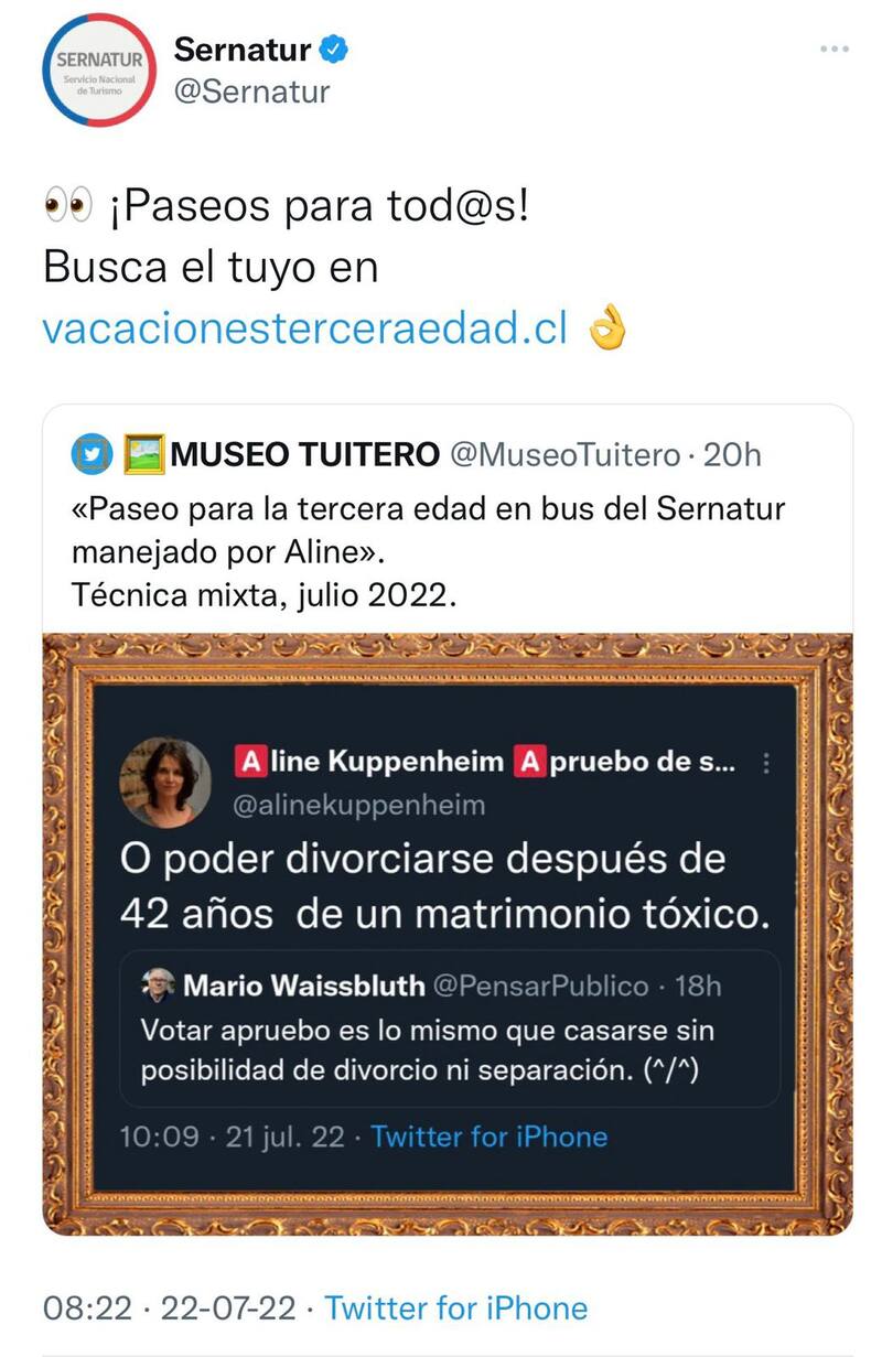 Tras la interacción de ambos en la red social, una tercera cuenta aseguró “paseo para la tercera edad en bus del Sernatur manejado por Aline.″, lo cual fue replicado por la cuenta oficial del Servicio Nacional de Turismo, que aseguró que hay “¡paseos para todos! Busca el tuyo en vacacionesterceraedad.cl”, mensaje que posteriormente fue borrado.