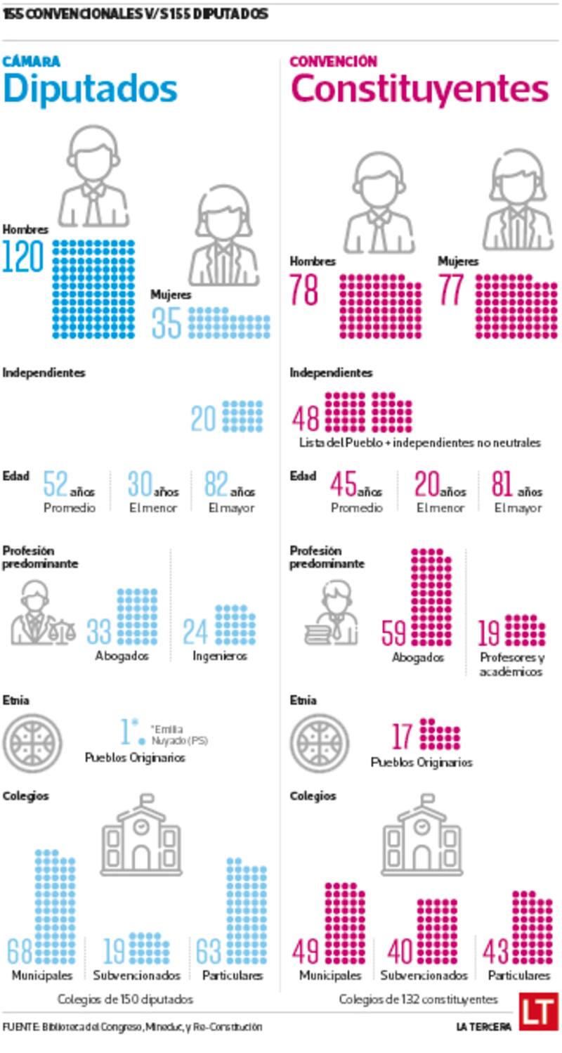 El órgano que redactará la nueva Constitución se eligió considerando los distritos electorales establecidos en las elecciones de diputados. Por eso la convención y la Cámara de Diputados tienen igual número de integrantes, sin embargo, el perfil de los elegidos en cada uno de los organismos muestra amplias diferencias.