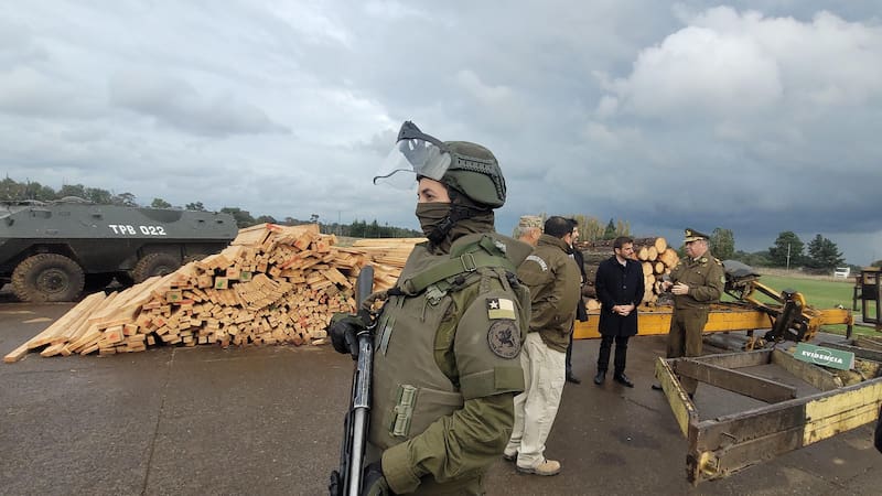 A su vez, el fiscal César Schibar, jefe de la Fiscalía de Alta Complejidad, explicó que “se logró desbaratar a una empresa delictiva dedicada no solo a la sustracción de madera, sino también a cometer los delitos de usurpación y asociación delictiva. En el operativo de Carabineros, se logró incautar tres aserraderos móviles, 100 metros cúbicos de madera aserrada y rollizos, una camioneta Ford, un furgón Hyundai, una motosierra, cuatro celulares y una escopeta, además de 23 cartuchos calibre 12″.