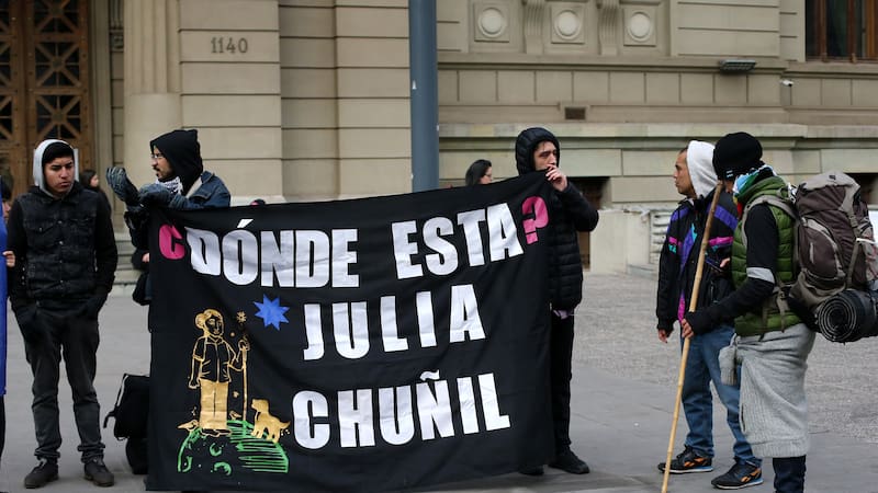 “Dónde está Julia Chuñil. Dónde está Julia Chuñil”, repetía en forma de cántico un grupo de unas 15 personas apostadas en el frontis del Palacio de Tribunales durante la mañana de este lunes.