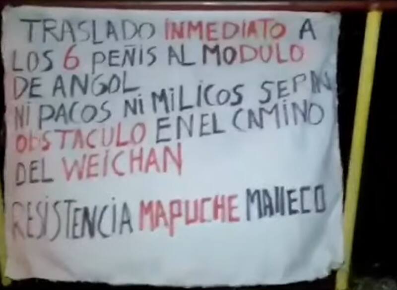 En el lugar dejaron una tela con una declaración escrita que hacía alusión a los comuneros presos trasladados desde Angol a otros penales luego del motín en que secuestraron a tres funcionarios de Gendarmería en protesta por la negativa de visitas durante la jornada electoral del domingo 7 de mayo.