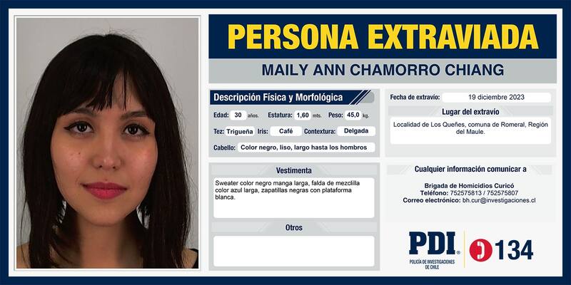 Treinta y ocho días han pasado desde que se perdió el rastro de Maily Ann Chamorro Chiang. Según informó la PDI, la joven fue vista por última vez el pasado 18 de diciembre en Los Queñes, una localidad precordillerana, ubicada a 36 kilómetros de Romeral, Región del Maule.