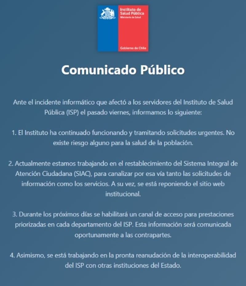 Desde el viernes pasado, el Instituto de Salud Pública (ISP) es la nueva víctima de los ciberataques que han golpeado a varias instituciones del Estado. Una intromisión en sus sistemas mantiene su sitio web caído y ha dejado en pausa varios de sus servicios clave: desde trámites ciudadanos y consultas de registros sanitarios, hasta gestiones que afectan directamente el trabajo de Aduanas para el ingreso de productos al país. El organismo intenta contener los daños, pero a la fecha la solución sigue sin aparecer.
