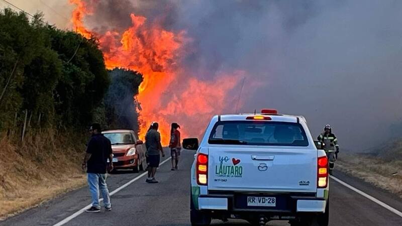Un incendio forestal de grandes proporciones se registra en la comuna de Lautaro, emergencia que ha provocado la interrupción del tránsito vehicular en la ruta que conecta con la comuna de Curacautín, en la Región de La Araucanía.
