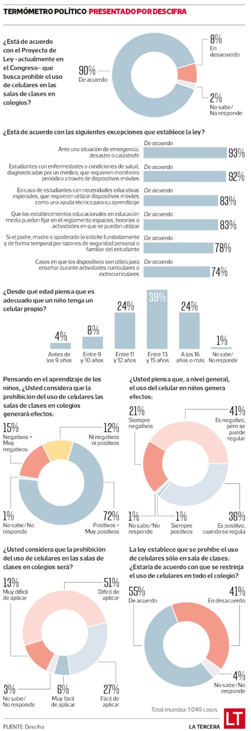 Lo primero que reveló el sondeo fue el amplio respaldo que tiene la iniciativa legal entre la ciudadanía. Ante la pregunta: ¿Está de acuerdo con el proyecto de ley -actualmente en el Congreso- que busca prohibir el uso de celulares en las salas de clases en colegios? Nueve de cada diez consultados dijo estar de a favor. Solo un 8% sostuvo no estar de acuerdo. Mientras un 2% no sabe o no responde.