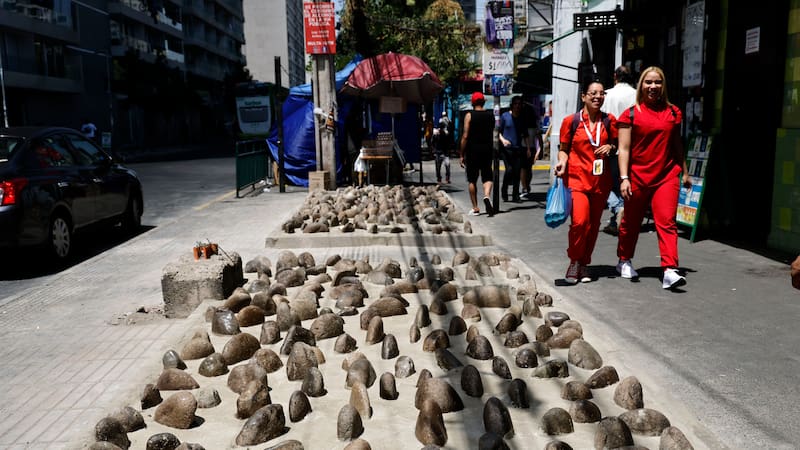 A los bolardos y jardineras antivendedores ambulantes instaladas en el entorno del Costanera Center en Providencia se suman hoy otras muestras de urbanismo hostil en el entorno de Estación Central. Se trata de unos bolones de piedra pegados con cemento a la vereda. Sin embargo, los resultados no han sido los esperados. Ambulantes que antes vendían desplegando sus paños, ahora los reemplazaron por mesas plegables, lo que interfiere aún más con el tránsito peatonal.
