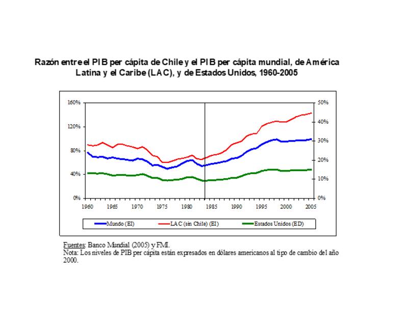 Habiendo analizado el tema de la Pobreza, veamos lo que dice Matamala en relación al ingreso per cápita. El periodista dice que el “milagro de Chile” es una falacia porque “el aumento en el ingreso per cápita se produjo una vez terminado el régimen de Pinochet”. Una vez más es bueno revisar los datos. El siguiente gráfico (Documento de Trabajo 365 del Banco Central 2006, Klaus Schmidt-Hebbel), muestra la evolución del ingreso per cápita de Chile en comparación con el resto de nuestra región, el mundo y Estados Unidos. Es evidente que el punto de inflexión para el ciclo virtuoso del crecimiento del ingreso per cápita en nuestro país comienza en la segunda mitad de los 80.