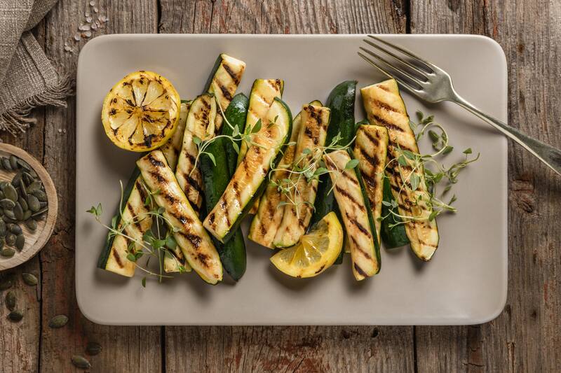 3. Pon los zapallitos ya aceitados en tu parrilla caliente durante 1 minuto por cada lado o hasta que estén ligeramente carbonizados y tiernos. Pon los zapallitos en una fuente y sírvelos rociados con el aliño de aceituna verde.
