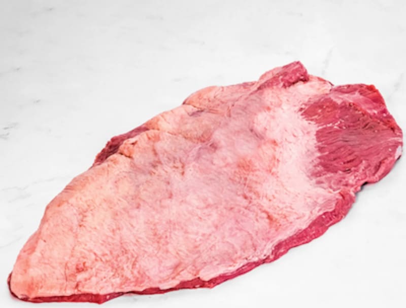2. Hay dos secciones de la carne, la punta y la parte plana, y la fibra que corre en dos direcciones diferentes entre las dos secciones. Asegúrate de cortar primero por la mitad, donde la punta se une con la parte plana, para separar las dos secciones.