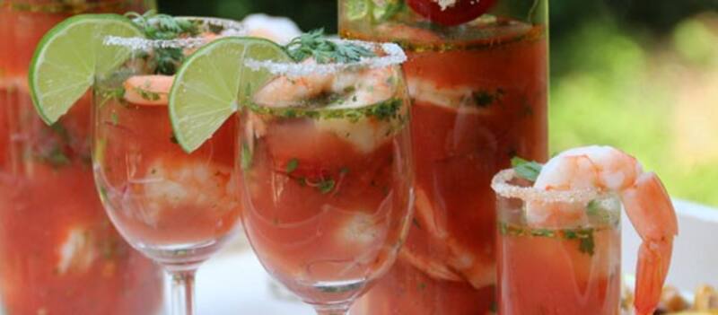 En un vaso, poner tres cubos de hielo y con mucho cuidado depositar en el fondo la carne bien limpia de una almeja. Agregar vodka a gusto y luego completar el vaso con jugo de tomates. Condimentar con sal de apio, un chorrito de tabasco, otro de salsa inglesa y cerrar todo con el jugo de medio limón. Revolver una vez y finalmente decorar el vaso con las colitas de camarón, previamente aliñadas con un par de gotas de sriracha cada una.