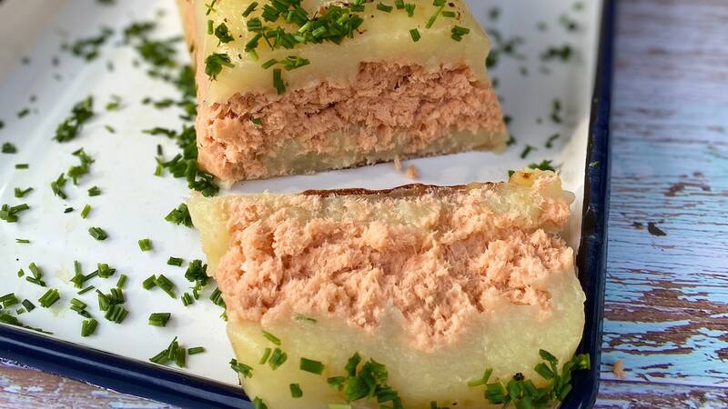- Encender el horno a 200º, con calor por arriba y abajo. Forrar con papel mantequilla de cocina un molde de queque o una budinera de unos 30 cms. Cubrir el molde con la mitad del puré, formando una primera capa de unos dos dedos de grosor. Emparejar bien con una espátula o mezquino, y después agregar toda la pasta de salmón. Por último, cubrir con el resto de puré.