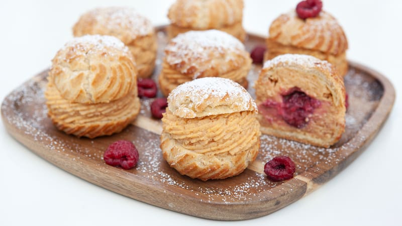- Sacar la crema pastelera del refrigerador. Cuando los profiteroles estén fríos, cortarlos por la mitad y rellenarlos con la crema pastelera de maní y poner en el centro tres frambuesas enteras. Tapar y terminar espolvoreando azúcar flor.