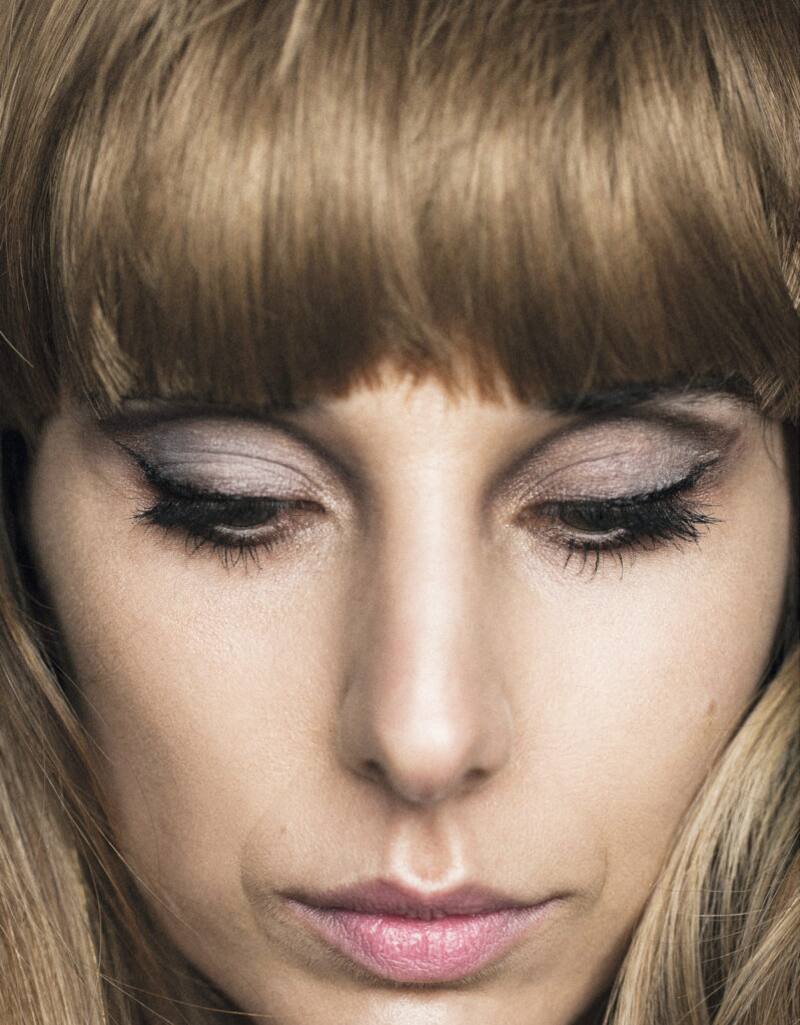 Pestañas grumo / labios rosa / flequillo