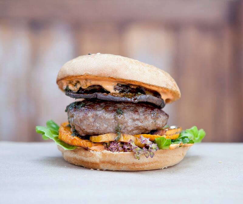 1. Corderito beeergeeer: hamburguesa de cordero al romero, rellena de queso de cabra, sobre mix de camote frito y berenjenas. Con salsa dulce de menta en pan brioche ($ 7.300).