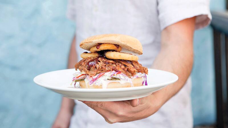 3. Costillita bbq: carne deshilachada de cerdo, con pepinillos, aros de cebolla, coleslaw y salsa de rábano picante ($ 7.600, en la foto principal).