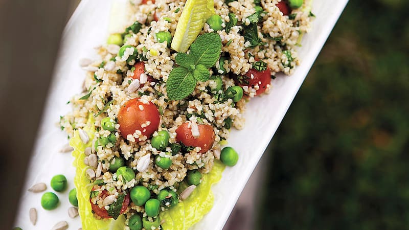 Ensalada estilo falafel con arvejas, bulgur y tomate
