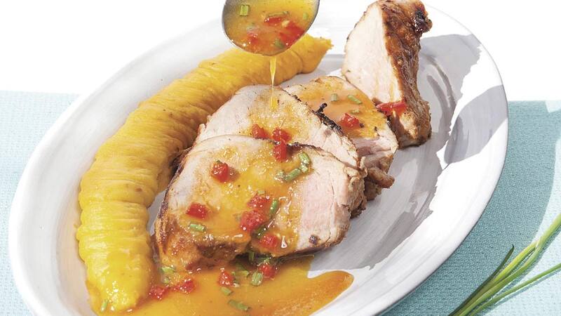 3. Calentar el grill del horno (calor arriba). Sazonar los filetitos de cerdo con sal y pimienta, y adobar con ⅓ taza de la salsa de maracuyá reservada. Grillar a fuego medio 15 minutos, dando vuelta la carne y adobando frecuentemente con la salsa o hasta que la carne esté acaramelada por fuera y en su punto por dentro. Dejar reposar 5-7 minutos antes de cortar. Cortar la carne en tajadas.