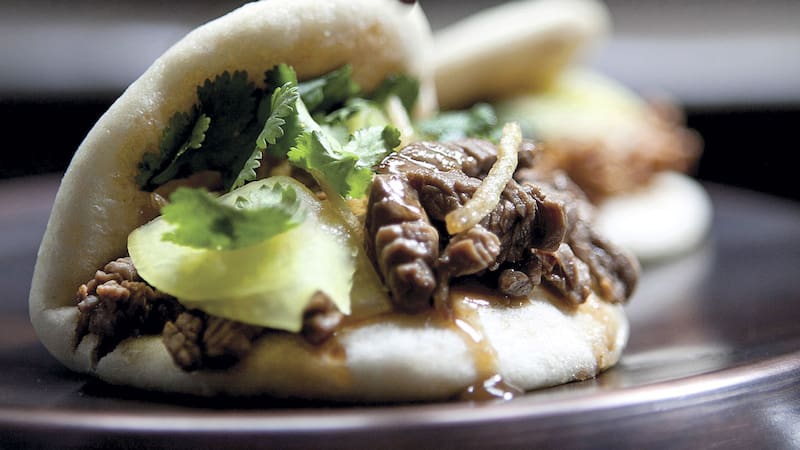 4. En un wok con agua hirviendo colocar una vaporera forrada con papel mantequilla, encima colocar de a poco los baos, tapar y cocinar a fuego medio hasta que la masa esté cocida. Si fuera necesario, agregar más agua caliente al wok. Retirar los baos, eliminar el papel de entremedio y rellenar con la carne, papas fritas, nabo y cilantro. Repetir el mismo procedimiento con el resto de baos y rellenos. Servir de inmediato.