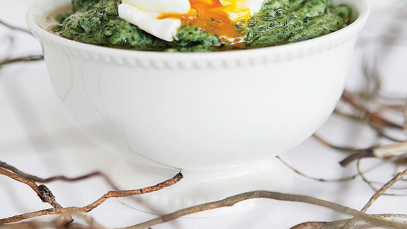 Huevo pochado sobre puré de papas con espinacas y mantequilla negra
