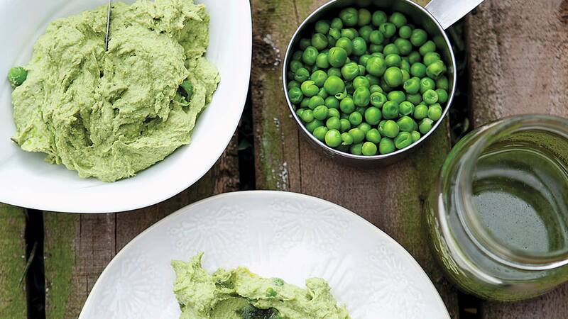 2. Para el hummus. En una olla con agua fría colocar las arvejas con una pizca de sal y cocinar 6 a 10 minutos o hasta que estén cocidas y tiernas. Estilar y dejar enfriar. En la procesadora colocar las arvejas, perejil, comino, ajo, tahini, jugo de limón, aceite y sazonar con sal y pimienta; procesar hasta obtener una mezcla cremosa (si es necesario agregar un poco de agua fría).