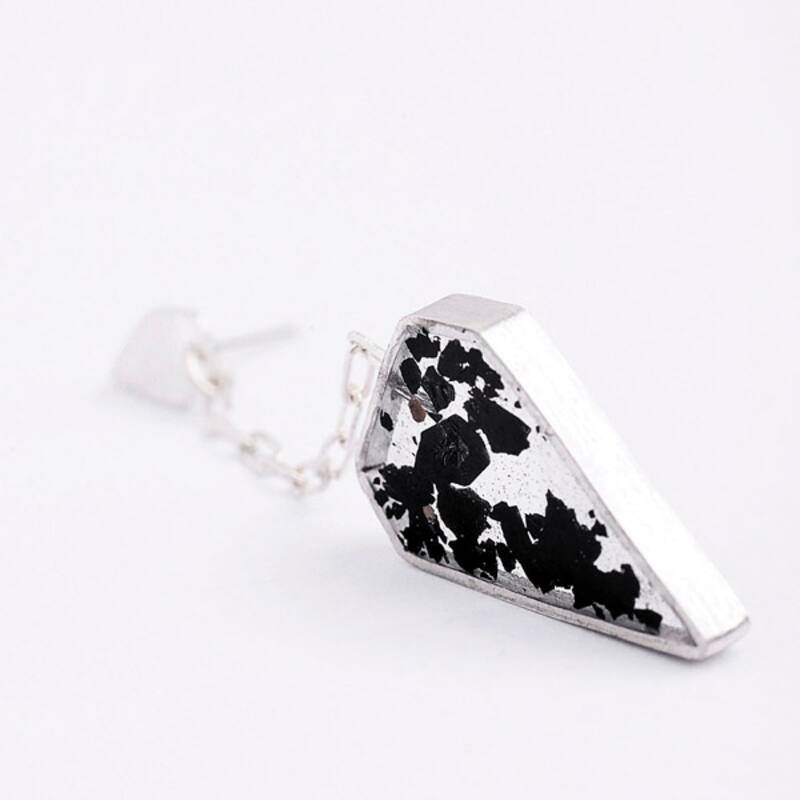 Su primera colección, diseñada y fabricada por ella, fue Carbono 14, de imponentes piezas con formas geométricas, hechas en plata y aplicaciones de carbón mineral extraído de la Patagonia. "Es una roca que nunca antes se ha usado en joyería. Incluso, tiene una connotación negativa, la gente tiende a asociarla a la producción de energía sucia y barata. Pero a mí, que viví hasta los 15 años en Punta Arenas, siempre me llamó la atención su visualidad y ahora quise convertirlo en joya", dice María Paz, quien recolectó el carbón mineral que llevó el mar a la orilla de Isla Riesco, en el Estrecho de Magallanes.