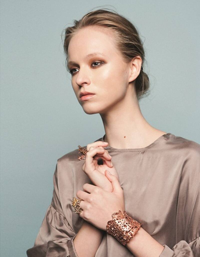 Pulsera de cobre. Mano derecha, anillos de bronce. Mano izquierda, anillos de bronce con baño de oro. De la colección Ramage.