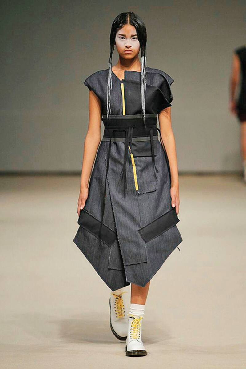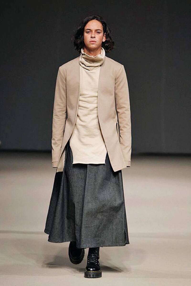 La pasarela y el fondo son blancos. Los modelos avanzan lentamente, como en una ceremonia, vestidos como monjes u obispos con una impecable sastrería de innovadores cortes en pantalones, chaquetas y túnicas. Diseños elaborados en denim, drill, canvas y jersey dialogan de manera inesperada, pero coherente, con detalles góticos y sadomasoquistas: amarras de cuero en el cuello, látigos en las manos y bototos negros.