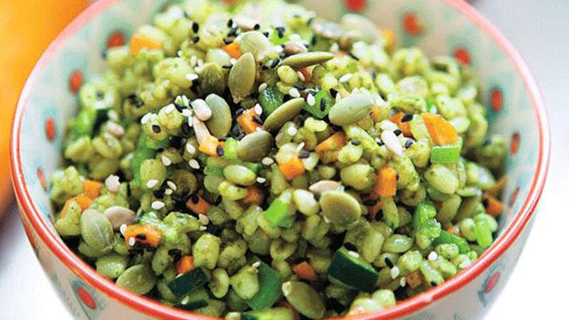 - Quínoa tibia con pesto y tomate en cubos + gran ensalada de hojas verdes con sésamo y frutos secos.