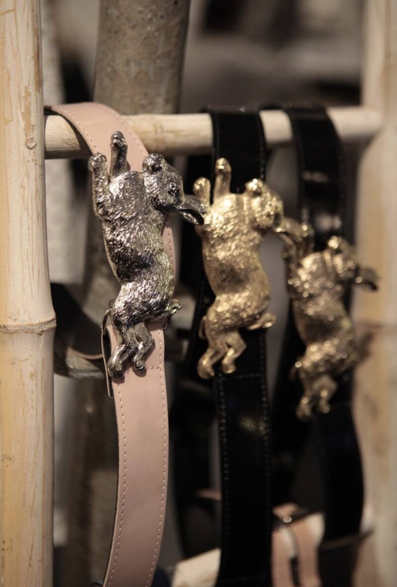 Cinturón de cuero acharolado en negro y rosa palo con hebilla de conejo metálico (plateado y dorado). Tallas S-M-L. $39.990. Diseño nacional en tienda de Karyn Coo. Stand 57.