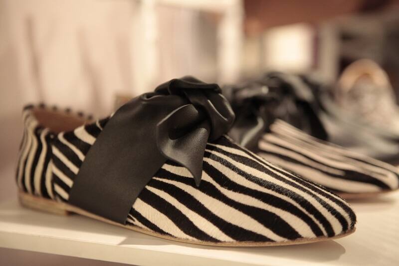 Babucha de pelo con estampado de zebra. Con lazo de napa negra, también hay de pelo negro con lazo rojo, y en negro y plata. $70.000 en Candelaria Pérez, stand 08.
