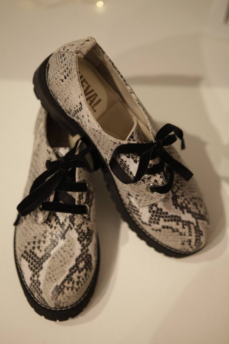 Zapato con inspiración en modelo oxford, diseñados y hechos en Chile con cordón tipo terciopelo y con estampado con en inspiración cobra. También en negro y café. En tienda Cheval. Stand 134. $68.990.