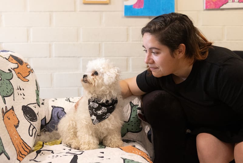 Entre los diversos profesionales que acompañaron al Gaspi en su estadía en Casa de Luz, estaban las especialistas de la Fundación Tregua, que realizan terapias y actividades asistidas con perros. Estos perritos iban una vez por semana a Casa de Luz para acompañar a los niños, niñas y sus familias. En particular, al Gaspi lo visitaba Canela, una perrita de color café. Un día, apareció un cachorro de bichón que recién comenzaba su entrenamiento para ser perro de compañía. Se llamaba Benito. “¡Lo encontré tan lindo! Fue como amor a primera vista, pero no con el Gaspi, sino conmigo”, cuenta Yenny. Como Benito todavía era muy cachorro, no participaba mucho en las terapias, así que ella se ofrecía a tenerlo en brazos durante la actividad. “Para mí fue una contención, me sirvió mucho estar con él”, confiesa.