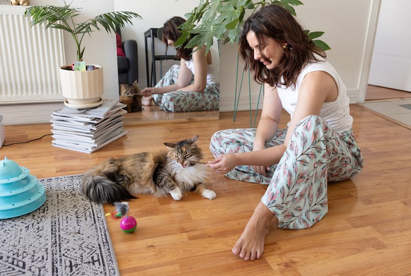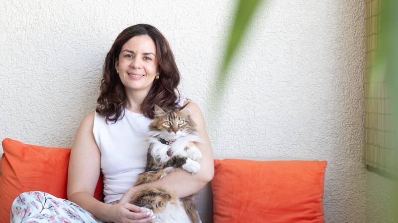 Y es tan así que dice que hasta puede distinguir sus maullidos. “Sé cuándo quiere que le ayude a cazar una polilla, cuándo quiere jugar, cuándo quiere que le haga cariño. Tener un animal es sumergirse en un lenguaje nuevo por completo. Nosotras jugamos mucho; me hace reír mucho”, dice. También le llena el corazón. “Es mi familia, absolutamente, como cualquier otra. Pienso en ella constantemente, busco su bienestar, juego con ella, hablo con ella. Ella me entiende perfectamente; yo la entiendo a ella”.