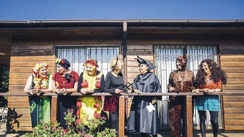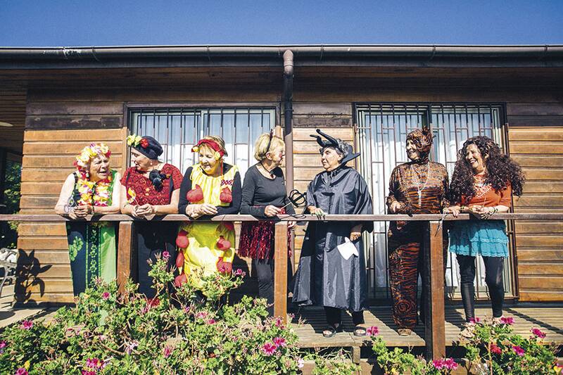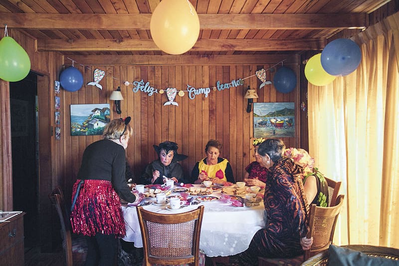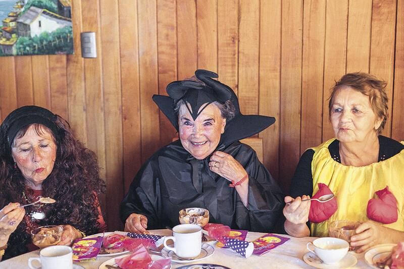 Nena cumplió 84 años y decidió celebrarlo con una fiesta de disfraces junto a sus mejores amigas. Está vestida con una falda roja brillante, una humita y unas orejas de ratón; es Minnie Mouse. Juanita, una de sus amigas, lleva un enterito de tigre y bigotes pintados en la cara. Jeanette está envuelta en un pareo verde, coronada con una tiara de flores, a lo pascuense. Anmerys lleva un traje que, dependiendo de la generación que lo vea, es de Mefistófeles o de Maléfica, con cuernos en la cabeza, una capa negra y uñas largas. Se lo hizo su nieta especialmente para la ocasión. Leonor está disfrazada de Frida Kahlo, con un conjunto típico mexicano y un peluche de mono en su hombro. La más vistosa es la del traje de cuncuna amarilla, Gilda; tiene bolas rojas pegadas por toda la parte delantera de su cuerpo que hacen de patitas, pero sin dudas la que saca más risas es la Lucy, quien llegó vestida de hippie y la rebautizaron como Shakira por la enorme peluca chascona que andaba trayendo.