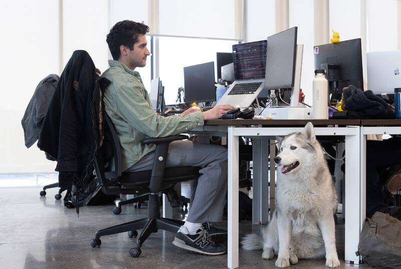 Mitchel Jiménez trabaja desde hace cuatro años en Kredito, una startup que empezó el año 2019. Desde sus inicios, la oficina ha sido siempre pet friendly, aunque Loki es el primero en aprovechar el beneficio. “Como todo el mundo es relativamente joven, la gente no se molesta tanto. Hay personas que no están acostumbradas entonces no les gusta que los fastidie, pero no les molesta que esté en la oficina”, explica.