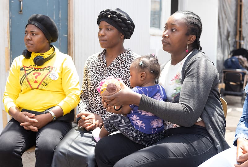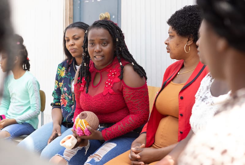 En uno de los pasajes del campamento Millantú, en la comuna de Puente Alto, un grupo de mujeres haitianas se reúne en círculo. En el centro, una mujer sostiene un modelo de mama tejida a crochet. Lo usa para explicar, en creol, cómo acoplar correctamente la boca del bebé al pecho. A su alrededor, las demás asienten, algunas con sus hijos en brazos, escuchan con atención.